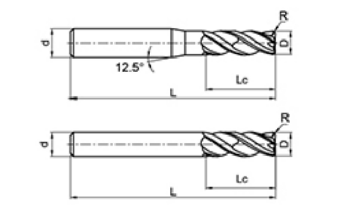 | Dòng công cụ | Đường kính | Bán kính | Bán kính góc | Chiều dài sáo | Chiều dài hiệu quả | Chiều dài tổng thể | Chân Dia | |||