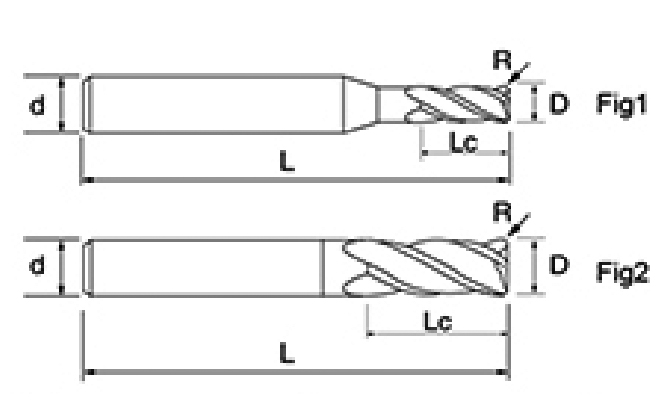 | Dòng công cụ | Đường kính | Bán kính | Bán kính góc | Chiều dài sáo | Chiều dài hiệu quả | chiều dài tổng thể | Chân Dia | |||