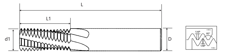 | Cao độ | Răng Thô UNC | Răng đẹp UNF | Răng siêu mịn UNEF | Đường kính lưỡi d1 | Chiều dài lưỡi hiệu quả L1 | Đường kính tay cầm D | Chiều dài tổng thể L | Số lượng lưỡi | Đường kính lỗ đáy |